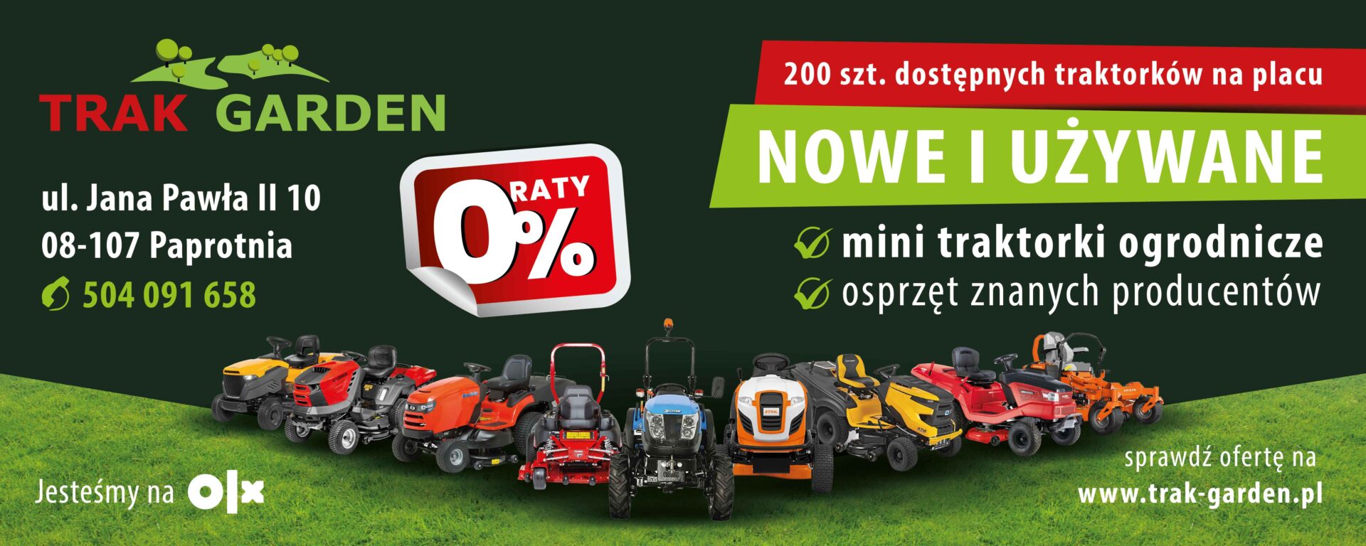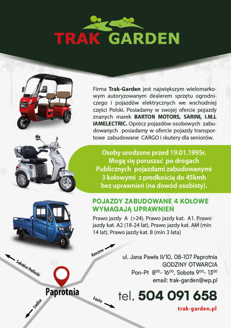 Firma Trak-Garden jest największym autoryzowanym dealerem sprzętu ogrodniczego we wschodniej części Polski. Posiadamy w swojej ofercie traktorki ogrodowe znanych marek: STIHL, MTD, CUB-CADET, STIGA, CASTELGARDEN, WOLF GARTEN, ALKO by SOLO,GRASS, CEDRUS, SNAPPER, SIMPLICITY, FERRIS, ARIENS, SOLIS.